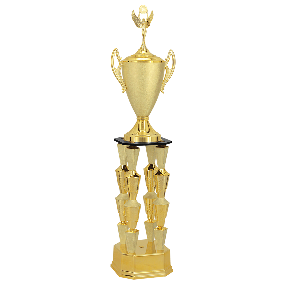 TROFÉU EM POLÍMERO METALIZADO A ALTO VÁCUO MEDIDAS: ALTURA – 123 cm. LARGURA SUPERIOR – 31 cm. LARGURA INFERIOR – 26,50 cm. ALTURA DA BASE- 10,70 cm. PESO APROXIMADO – CORES- DOURADO, DOURADO TEXTURIZADO, PRETO. CORES ALTERNATIVAS: PRATA. COMPOSIÇÃO: COMPONENTES FABRICADOS EM POLÍMERO: BASE OITAVADA, SUPORTE, CONES, PIRÂMIDES, TAMPAS. TAÇA COM ALÇAS, TAMPA, ESTATUETA SUPERIOR. OUTROS COMPONENTES: BASE EM MDF, FERRAGENS PARA FIXAÇÃO.