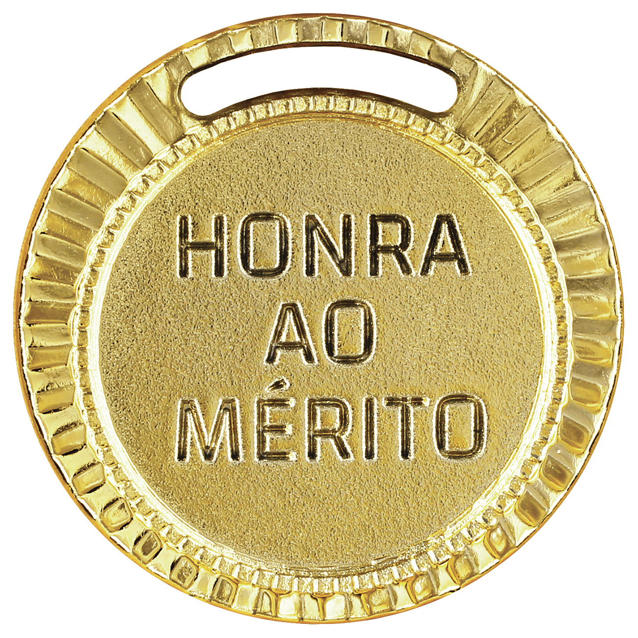 Medalha redonda fundida em liga metálica de zamac, com 35 mm de diâmetro, gravada com os dizeres “honra ao mérito” em baixo relevo e com detalhes raiados na borda em alto relevo. Espessura máxima de 2,6 mm. Metalizada nas cores dourada, prata ou bronze. Suporte para fita com 1,5 cm de largura. A medalha pode vir acompanhada de fita de cetim nas cores azul, vermelha, amarela, branca ou verde com 1,5 cm de largura.