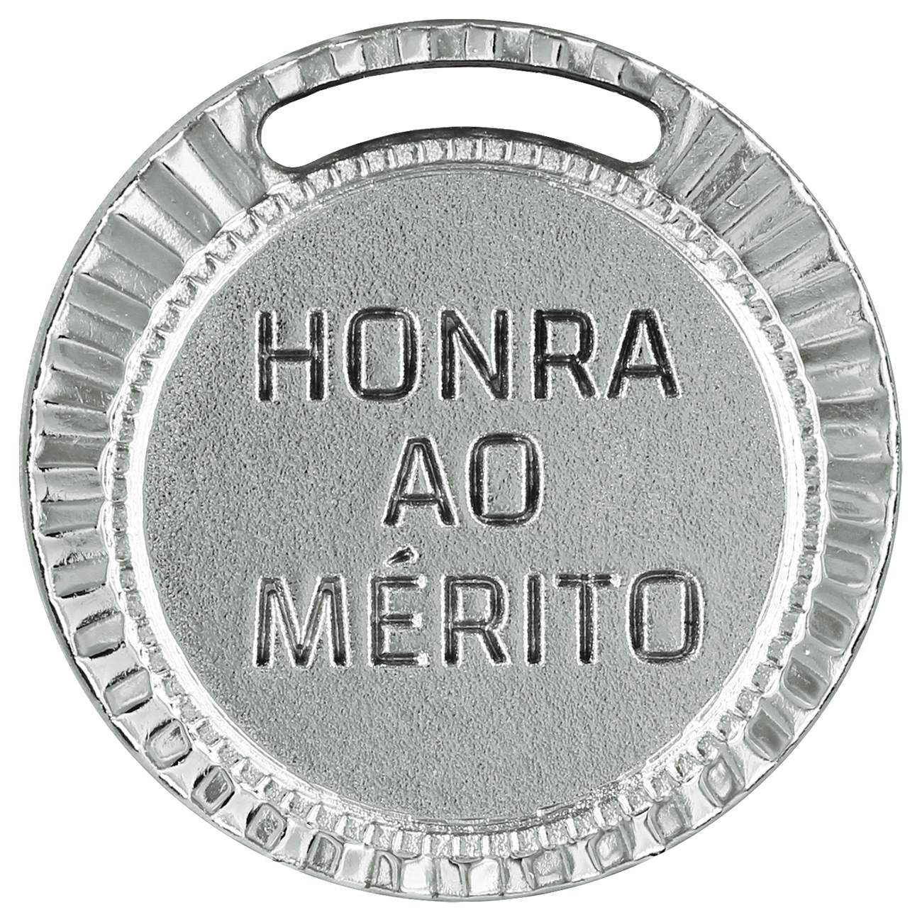 Medalha redonda fundida em liga metálica de zamac, com 35 mm de diâmetro, gravada com os dizeres “honra ao mérito” em baixo relevo e com detalhes raiados na borda em alto relevo. Espessura máxima de 2,6 mm. Metalizada nas cores dourada, prata ou bronze. Suporte para fita com 1,5 cm de largura. A medalha pode vir acompanhada de fita de cetim nas cores azul, vermelha, amarela, branca ou verde com 1,5 cm de largura.