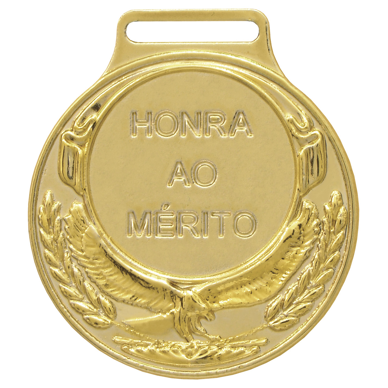 Medalha redonda fundida em liga metálica de zamac, com 39 mm de diâmetro, gravada com os dizeres “honra ao mérito” em baixo relevo e com gravura de águia e um ramo em alto relevo na parte inferior. Espessura máxima de 2,1 mm. Metalizada na cor dourada. Suporte para fita com 1,5 cm de largura. A medalha pode vir acompanhada de fita de cetim nas cores azul, vermelha, amarela, branca ou verde com 1,5 cm de largura.