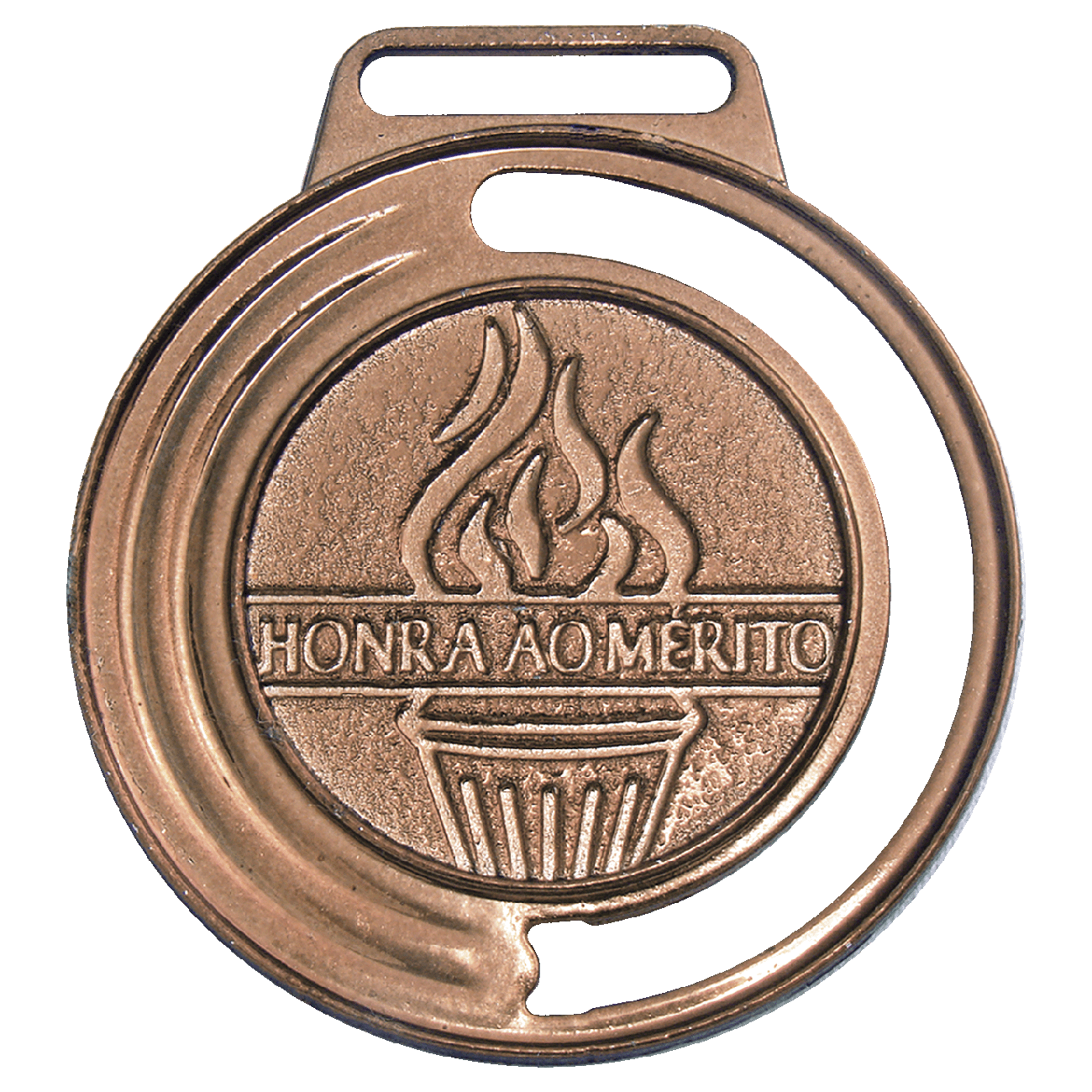 Medalha redonda fundida em liga metálica de zamac, com o tamanho de 40 mm de diâmetro e centro liso com 25 mm de diâmetro. Com tocha no centro com descrição de Honra ao Mérito em baixo relevo, no lado esquerdo vazado e no lado direito com dois frisos. Espessura máxima de 2,2 mm. Metalizada na cor bronze. Suporte para fita com 1,5 cm de largura. A medalha pode vir acompanhada de fita de cetim nas cores azul, vermelha, amarela, branca ou verde com 1,5 cm de largura.