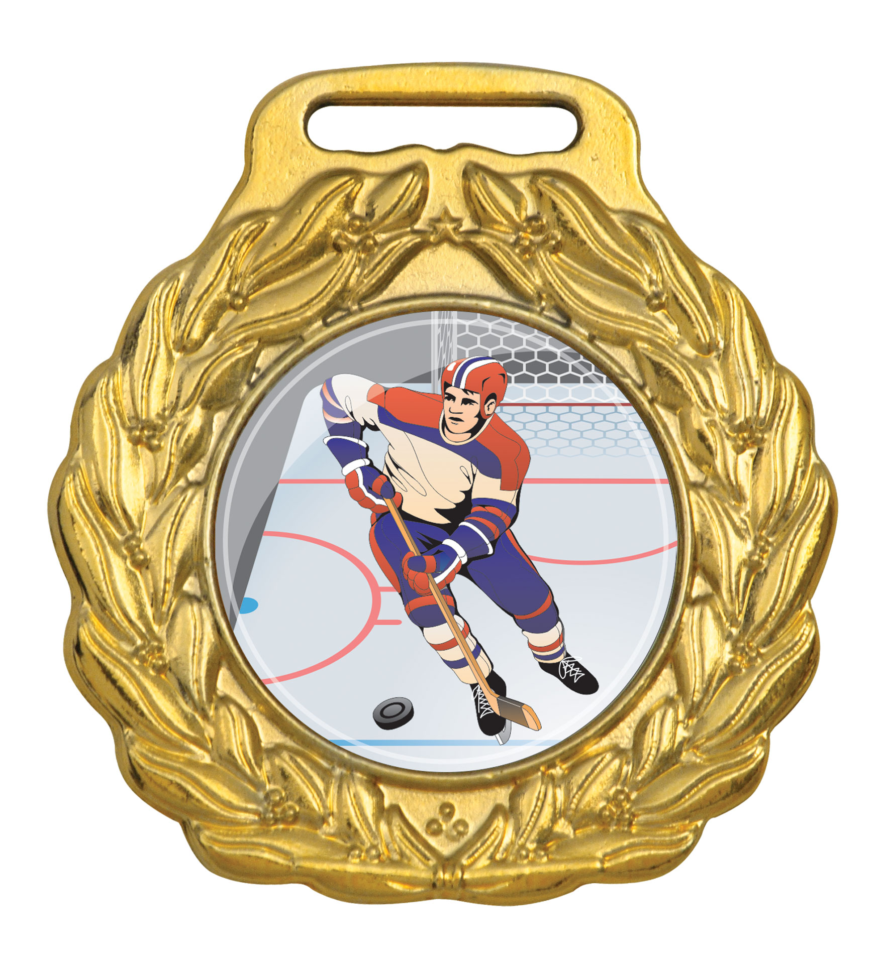 Medalha fundida em liga metálica de zamac, com o tamanho de 45 mm de diâmetro e centro liso com 25 mm de diâmetro. Ao redor da medalha uma coroa de louros em alto relevo. Espessura máxima de 2,2 mm. Metalizada na cor dourada. Suporte para fita com 1,5 cm de largura. A medalha pode vir acompanhada de fita de cetim nas cores azul, vermelha, amarela, branca ou verde com 1,5 cm de largura.