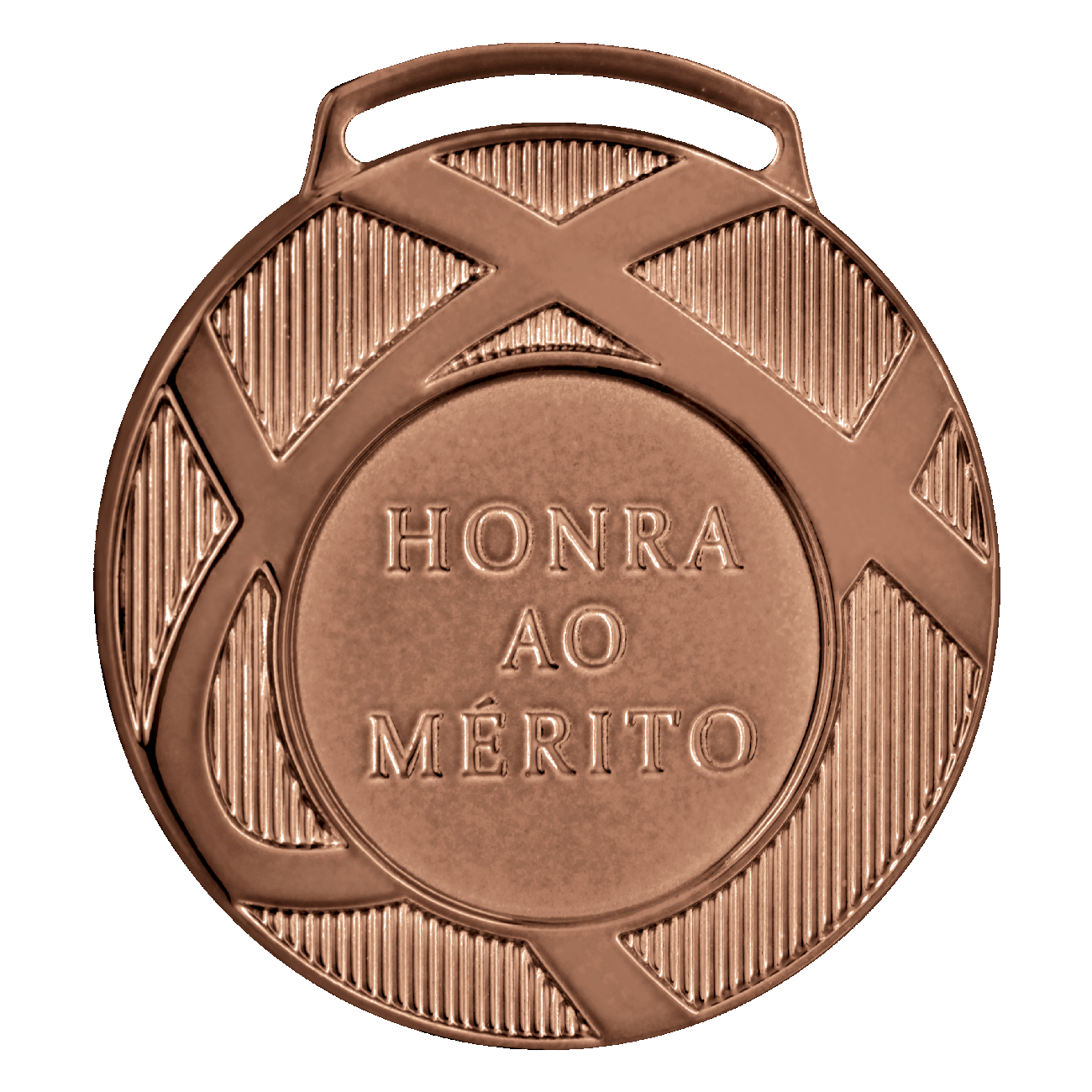 Medalha fundida em liga metálica de zamac, com o tamanho de 60 mm diâmetro e centro com inscrição “honra ao mérito” em baixo relevo com 35 mm de diâmetro. Com desenho interno polido e com frisos raiados. Espessura máxima de 3,7 mm. Metalizada na cor bronze. Suporte para fita com 2,5 cm de largura. No verso da medalha espaço liso para colocação de adesivo com 35 mm de diâmetro. A medalha pode vir acompanhada de fita de cetim nas cores azul, vermelha, amarela, branca ou verde com 1,5 cm de largura ou fita de gorgorão nas cores azul, azul-branco-vermelha ou verde-amarela com 2,5 cm de largura.