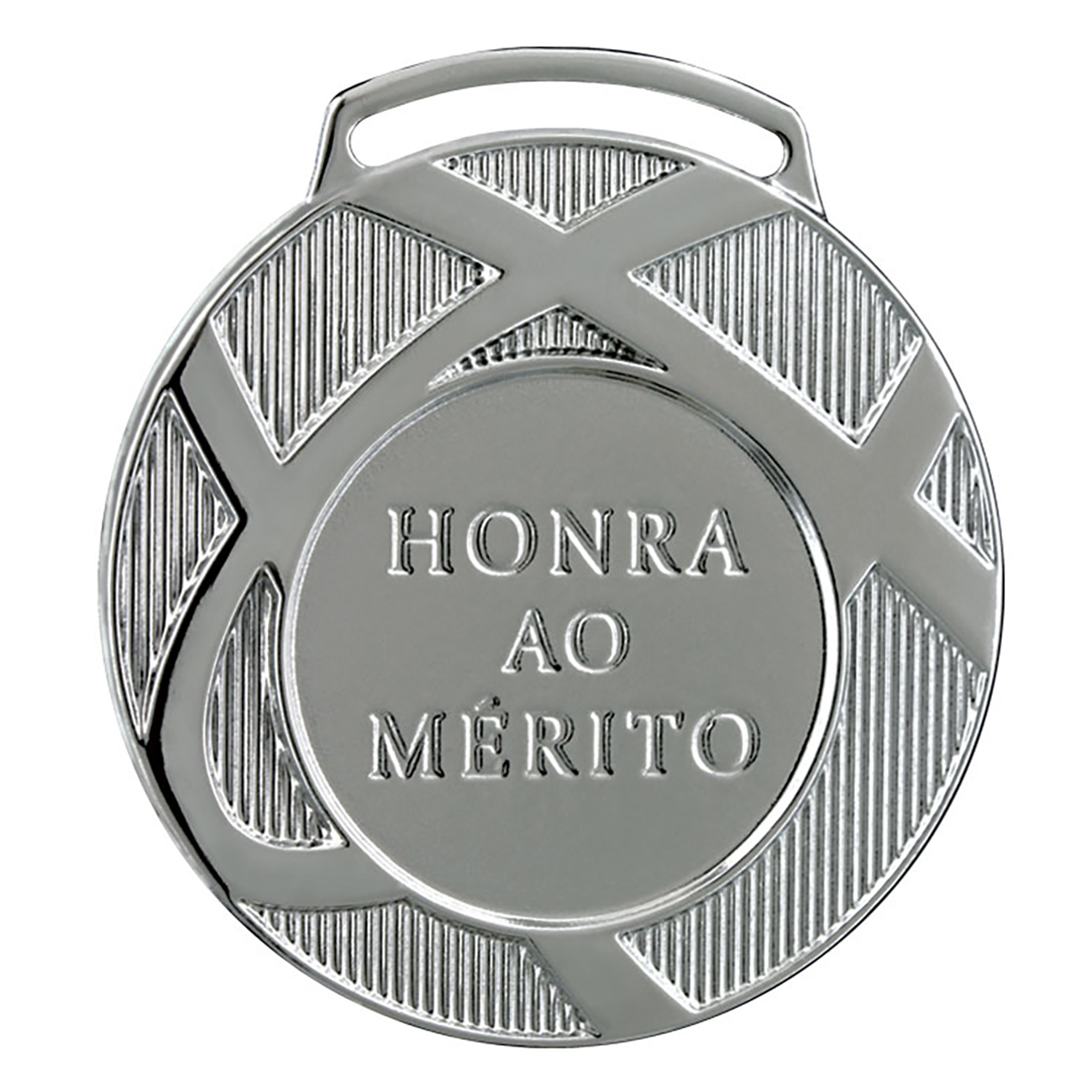 Medalha fundida em liga metálica de zamac, com o tamanho de 60 mm diâmetro e centro com inscrição “honra ao mérito” em baixo relevo com 35 mm de diâmetro. Com desenho interno polido e com frisos raiados. Espessura máxima de 3,7 mm. Metalizada na cor prata. Suporte para fita com 2,5 cm de largura. No verso da medalha espaço liso para colocação de adesivo com 35 mm de diâmetro. A medalha pode vir acompanhada de fita de cetim nas cores azul, vermelha, amarela, branca ou verde com 1,5 cm de largura ou fita de gorgorão nas cores azul, azul-branco-vermelha ou verde-amarela com 2,5 cm de largura.