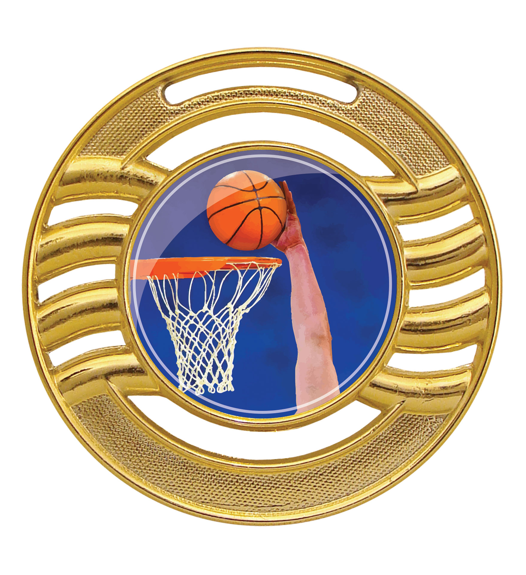 Medalha redonda fundida em liga metálica de zamac, com o tamanho de 65 mm de diâmetro e centro liso com 35 mm de diâmetro. Com quatro arcos vazados e polidos que suportam o centro liso e textura na borda da medalha. Espessura máxima de 3,4 mm. Metalizada na cor dourada. Suporte para fita com 2,5 cm de largura. A medalha pode vir acompanhada de fita de cetim nas cores azul, vermelha, amarela, branca ou verde com 2,5 cm de largura ou fita de gorgorão nas cores azul, azulbranco- vermelha ou verde-amarela com 2,5 cm de largura.