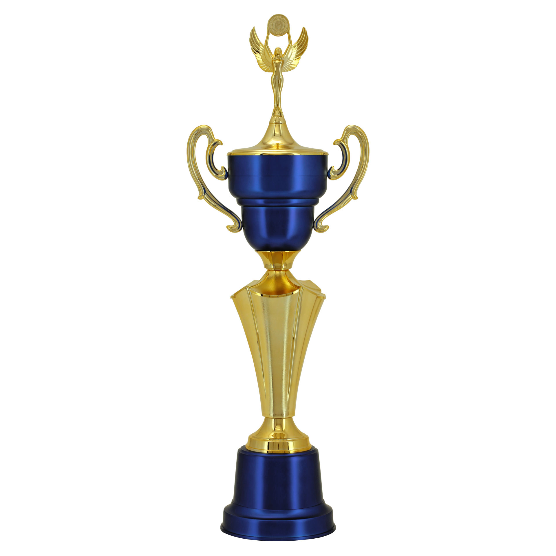 TROFÉU EM POLÍMERO METALIZADO A ALTO VÁCUO MEDIDAS: ALTURA – 92 cm. LARGURA SUPERIOR – 33 cm. LARGURA INFERIOR – 20,80 cm. ALTURA DA BASE- 14,80 cm. PESO APROXIMADO – 2,20 KG CORES- DOURADO, AZUL. CORES ALTERNATIVAS: TAÇA E BASE NAS CORES VERMELHA, VERDE OU DOURADA. COMPOSIÇÃO: COMPONENTES FABRICADOS EM POLÍMERO: BASE REDONDA, SUPORTES, CONE, TAMPA, TAÇA COM ALÇA E TAMPA E ESTATUETA SUPERIOR. OUTROS COMPONENTES: FERRAGENS PARA FIXAÇÃO.