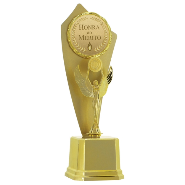 TROFÉU EM POLÍMERO METALIZADO A ALTO VÁCUO, COM CHAPA DE METAL MEDIDAS: ALTURA – 44 cm. LARGURA SUPERIOR – 15,2 cm. LARGURA INFERIOR – 13,10 cm. ALTURA DA BASE- 10 cm. PESO APROXIMADO – 1,55 KG CORES – DOURADO COMPOSIÇÃO: COMPONENTES FABRICADOS EM POLÍMERO: BASE OITAVADA, RAMO PARA COLAGEM DE ADESIVO, ESTATUETA DE DEUSA DA VITÓRIA OUTROS COMPONENTES: FERRAGENS PARA FIXAÇÃO, CHAPA DE METAL.