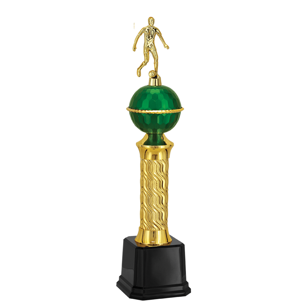 TROFÉU EM POLÍMERO METALIZADO A ALTO VÁCUO MEDIDAS: ALTURA – 55 cm. LARGURA SUPERIOR – 10 cm. LARGURA INFERIOR – 12,10 cm. ALTURA DA BASE- 9,10 cm. PESO APROXIMADO – CORES – DOURADO, PRETO E VERDE CORES ALTERNATIVAS: BOLA SUPERIOR NAS CORES AZUL, VERMELHA, PRETO, PRATA OU DOURADA. COMPOSIÇÃO: COMPONENTES FABRICADOS EM POLÍMERO: BASE OITAVADA, SUPORTES, COLUNA COM ESTRIAS, BOLA COM ANEL, ESTATUETA SUPERIOR. OUTROS COMPONENTES: FERRAGENS PARA FIXAÇÃO