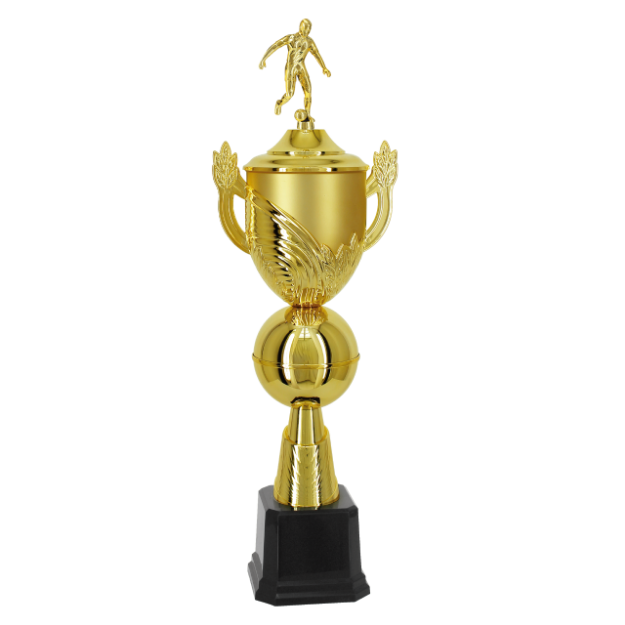 402572–DOFA – TROFÉU EM POLÍMERO METALIZADO A ALTO VÁCUO MEDIDAS: ALTURA - 68 cm. LARGURA SUPERIOR – 21 cm. LARGURA INFERIOR – 13,10 cm. ALTURA DA BASE- 10 cm. PESO APROXIMADO – 1,24 KG CORES- DOURADO E PRETO CORES ALTERNATIVAS – COPA NA COR VERMELHA, VERDE, AZUL OU PRATA COMPOSIÇÃO: COMPONENTES FABRICADOS EM POLÍMERO: BASE OCTOGONAL, CONE, BOLA COM ANEL, CESTA COM ALÇAS, COPA INTERNA TAMPA E ESTATUETA INTERCAMBIÁVEL. OUTROS COMPONENTES: FERRAGENS PARA FIXAÇÃO.