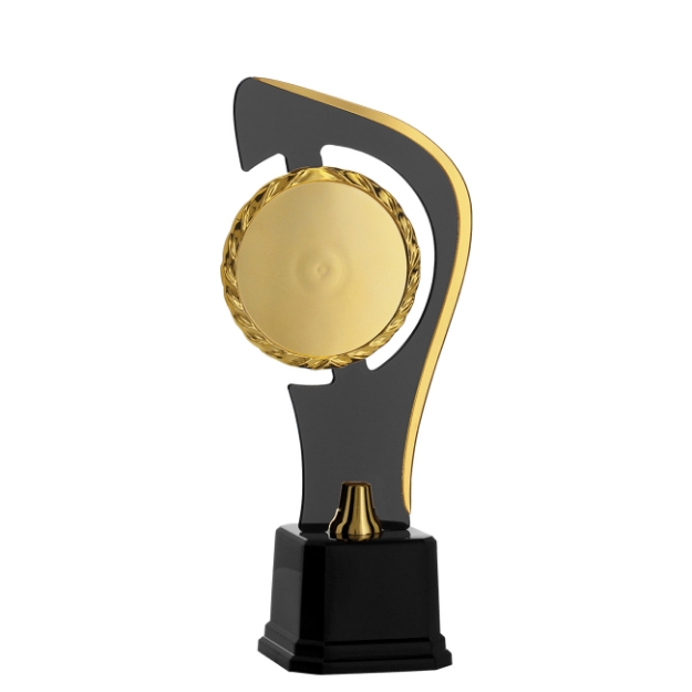 TROFÉU EM POLÍMERO COM PLACA DE ACRÍLICO MEDIDAS: ALTURA – 28 cm. LARGURA SUPERIOR – 11,50 cm. LARGURA INFERIOR – 8,50 cm. ALTURA DA BASE- 6,20 cm. PESO APROXIMADO – 450 gr CORES – DOURADO, PRETO COMPOSIÇÃO: COMPONENTES FABRICADOS EM POLÍMERO: BASE OITAVADA, PLACA DE ACRILICO, RAMO PARA COLAGEM DE ADESIVO, APLIQUE DE ACRÍLICO DOURADO. OUTROS COMPONENTES: FERRAGENS PARA FIXAÇÃO, FIXADOR DE PLACA FABRICADO EM ZAMAC.