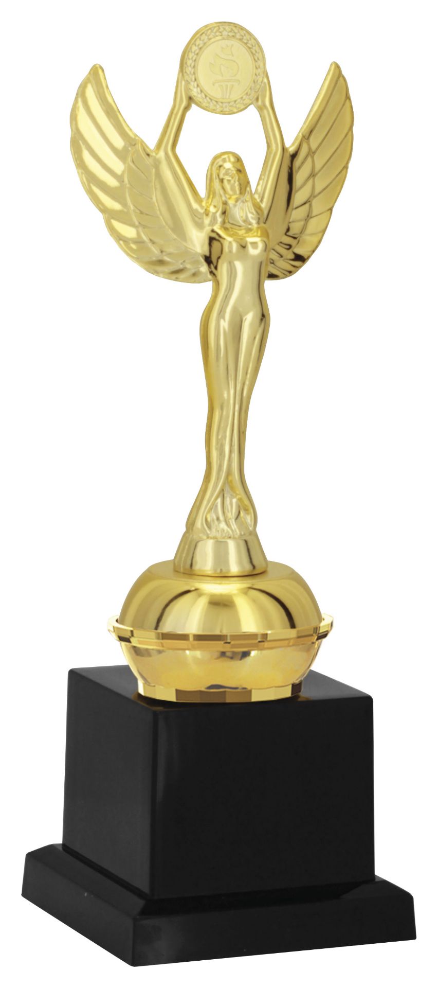 TROFÉU EM POLÍMERO METALIZADO A ALTO VÁCUO MEDIDAS: ALTURA – 18 cm. LARGURA SUPERIOR – 5,50 cm. LARGURA INFERIOR – 7,50 cm. ALTURA DA BASE- 6 cm. PESO APROXIMADO – CORES – DOURADO, PRETO COMPOSIÇÃO: COMPONENTES FABRICADOS EM POLÍMERO: BASE QUADRADA, SUPORTES, ESTATUETA SUPERIOR. OUTROS COMPONENTES: FERRAGENS PARA FIXAÇÃO.