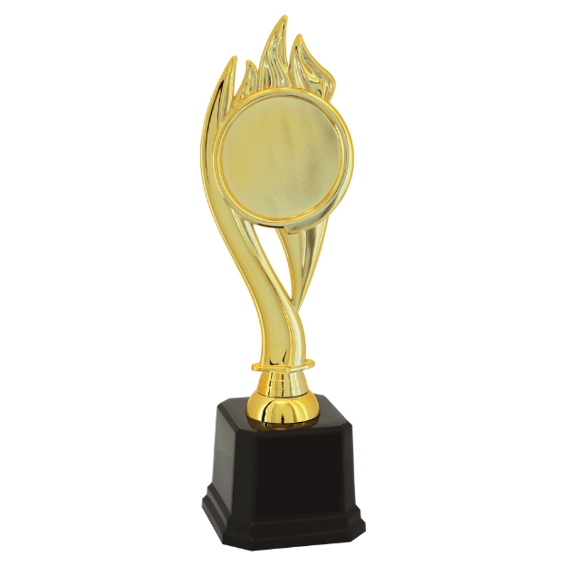 TROFÉU EM POLÍMERO METALIZADO A ALTO VÁCUO MEDIDAS: ALTURA – 34 cm. LARGURA SUPERIOR – 10 cm. LARGURA INFERIOR – 10,10 cm. ALTURA DA BASE- 7,50 cm. PESO APROXIMADO – 650 gr CORES – DOURADO, PRETO COMPOSIÇÃO: COMPONENTES FABRICADOS EM POLÍMERO: BASE OITAVADA, ESTATUETA SUPERIOR DE CHAMA COM ESPAÇO PARA COLAGEM DE ADESIVO. OUTROS COMPONENTES: FERRAGENS PARA FIXAÇÃO.