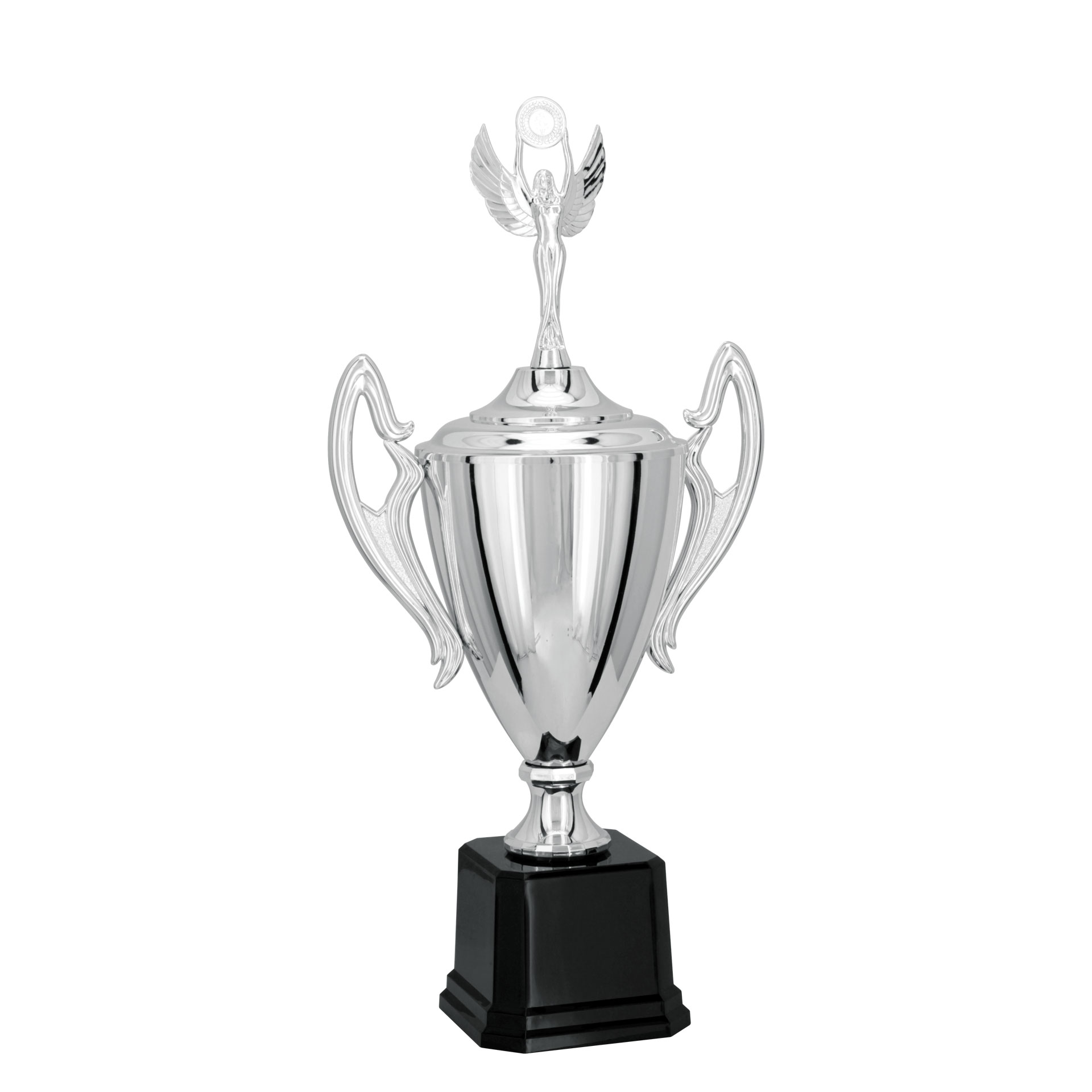 TROFÉU EM POLÍMERO METALIZADO A ALTO VÁCUO MEDIDAS: ALTURA – 56 cm. LARGURA SUPERIOR – 27 cm. LARGURA INFERIOR – 13,10 cm. ALTURA DA BASE- 10 cm. PESO APROXIMADO – CORES – PRATA, PRETO CORES ALTERNATIVAS: SUPORTE, TAÇA COM ALÇAS E TAMPA, ESTATUETA SUPERIOR NA COR DOURADA. COMPOSIÇÃO: COMPONENTES FABRICADOS EM POLÍMERO: BASE OITAVADA, SUPORTE, TAÇA COM ALÇAS E TAMPA, ESTATUETA SUPERIOR. OUTROS COMPONENTES: FERRAGENS PARA FIXAÇÃO.