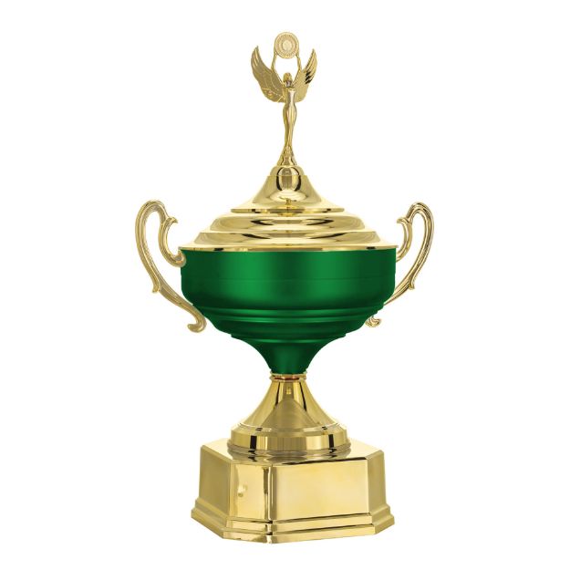 TROFÉU EM POLÍMERO METALIZADO A ALTO VÁCUO MEDIDAS: ALTURA – 71 cm. LARGURA SUPERIOR – 29 cm. LARGURA INFERIOR – 26,50 cm. ALTURA DA BASE- 10,70 cm. PESO APROXIMADO – CORES – DOURADO E VERDE. CORES ALTERNATIVAS: TAÇA COM ALÇAS NAS CORES AZUL, DOURADO, PRATA OU VERMELHA. COMPOSIÇÃO: COMPONENTES FABRICADOS EM POLÍMERO: BASE OITAVADA, SUPORTE, ANEL, TAÇA COM ALÇAS E TAMPA, ESTATUETA SUPERIOR. OUTROS COMPONENTES: FERRAGENS PARA FIXAÇÃO.