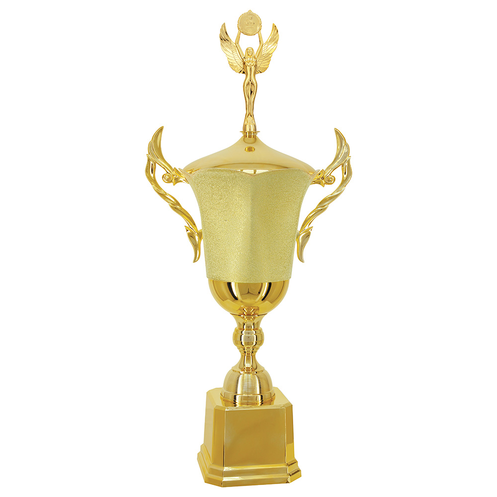 TROFÉU EM POLÍMERO METALIZADO A ALTO VÁCUO MEDIDAS: ALTURA – 107 cm. LARGURA SUPERIOR – 43 cm. LARGURA INFERIOR – 21,50 cm. ALTURA DA BASE - 16,50 cm. PESO APROXIMADO – 2,85 KG CORES – DOURADO CORES ALTERNATIVAS: PRATA OU BRONZE. COMPOSIÇÃO: COMPONENTES FABRICADOS EM POLÍMERO: BASE OITAVADA, SUPORTE, TAÇA COM ALÇAS E TAMPA, ESTATUETA SUPERIOR. OUTROS COMPONENTES: FERRAGENS PARA FIXAÇÃO.