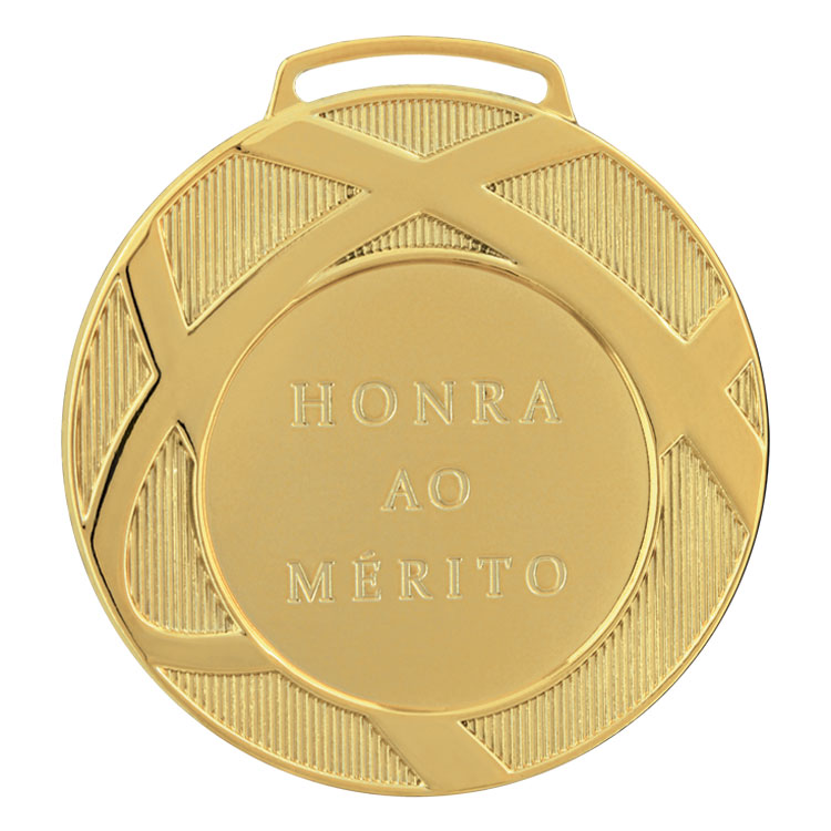 Medalha fundida em liga metálica de zamac, com o tamanho de 80 mm diâmetro e centro com inscrição “honra ao mérito” em baixo relevo com 50 mm de diâmetro. Com desenho interno polido e com frisos raiados. Espessura máxima de 4,0 mm. Metalizada na cor dourada. Suporte para fita com 2,5 cm de largura. No verso da medalha espaço liso para colocação de adesivo com 50 mm de diâmetro. A medalha pode vir acompanhada de fita de cetim nas cores azul, vermelha, amarela, branca ou verde com 1,5 cm de largura ou fita de gorgorão nas cores azul, azul-branco-vermelha ou verde-amarela com 2,5 cm de largura.