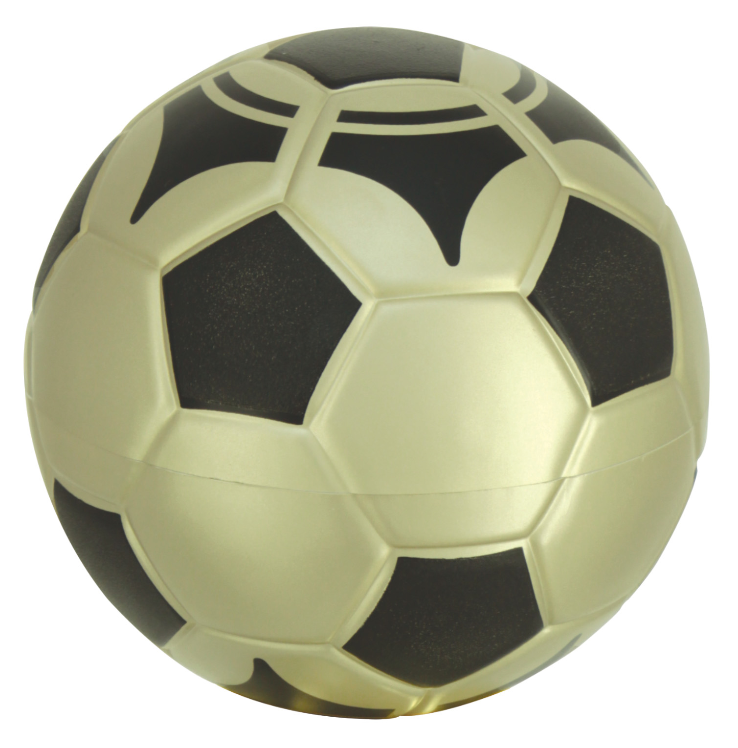FIGURA DE BOLA DE FUTEBOL DOURADO ACETINADO Figura de bola de futebol, fabricada em polímero, com 10,50 cm de largura, pintada na cor dourado acetinado e estampada com grafismo específico na cor preta.
