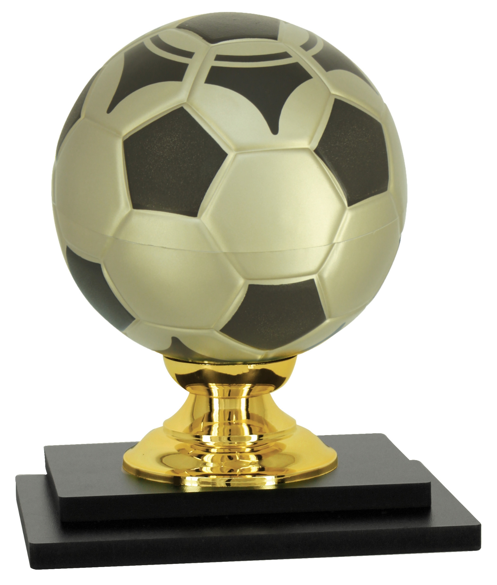 TROFÉU EM POLÍMERO COM BASE EM MDF MEDIDAS: ALTURA – 19 cm. LARGURA SUPERIOR – 13,50 cm – LARGURA INFERIOR – 15 cm – ALTURA DA BASE – 1,8 CM – PESO APROXIMADO – 0,440 KG CORES- DOURADO E PRETO COMPOSIÇÃO: COMPONENTES FABRICADOS EM POLÍMERO: SUPORTE E FIGURA FIXA DE BOLA DE FUTEBOL OUTROS COMPONENTES: FERRAGENS PARA FIXAÇÃO, BASE SOBREPOSTA EM DUAS CAMADAS DE MDF.